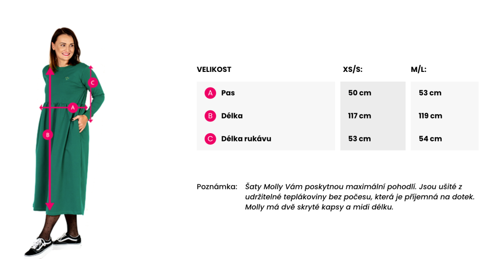 Šaty Molly Vám poskytnou maximální pohodlí. Jsou ušité z udržitelné teplákoviny bez počesu, která je příjemná na dotek. Molly má dvě skryté kapsy a midi délku. Více